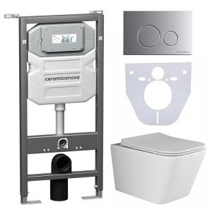 Сет 4 в 1: CN3007_1001M_1000Подвесной унитаз Metric Rimless арт. CN3007Шумоизоляционная панель для инсталляции арт. CN1000Система инсталляции для унитазов CERAMICANOVA Envision с кнопкой смыва Round цвет хром матовый и креплениями, арт. CN1001M Подвесной унитаз Metric Rimless CN3007, глубокий смыв, с крепежом для полностью скрытого монтажа, ультра тонким с сидением и крышкой с функцией плавного закрытия, дюропласт.Шумоизоляционная панель для инсталляции CN1000