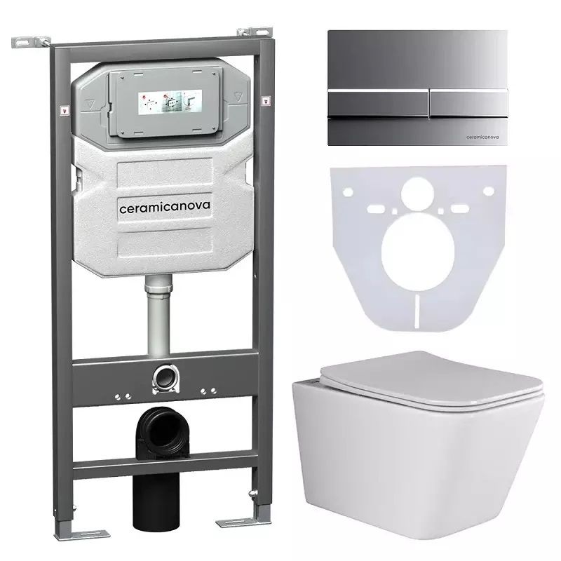 Сет 4 в 1: CN3007_1002M_1000Подвесной унитаз Metric Rimless арт. CN3007Шумоизоляционная панель для инсталляции арт. CN1000Система инсталляции для унитазов CERAMICANOVA Envision с кнопкой смыва Flat цвет хром матовый, креплениями, арт. CN1002M Подвесной унитаз Metric Rimless CN3007, глубокий смыв, с крепежом для полностью скрытого монтажа, ультра тонким с сидением и крышкой с функцией плавного закрытия, дюропласт.Шумоизоляционная панель для инсталляции CN1000