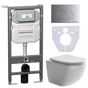 Сет 4 в 1: CN3009_1001M_1000Подвесной унитаз Forma Rimless арт. CN3009Шумоизоляционная панель для инсталляции арт. CN1000Система инсталляции для унитазов CERAMICANOVA Envision с кнопкой смыва Round цвет хром матовый и креплениями, арт. CN1001M Подвесной унитаз Forma Rimless CN3009, глубокий смыв, с крепежом для полностью скрытого монтажа, ультра тонким с сидением и крышкой с функцией плавного закрытия, дюропласт.Шумоизоляционная панель для инсталляции CN1000