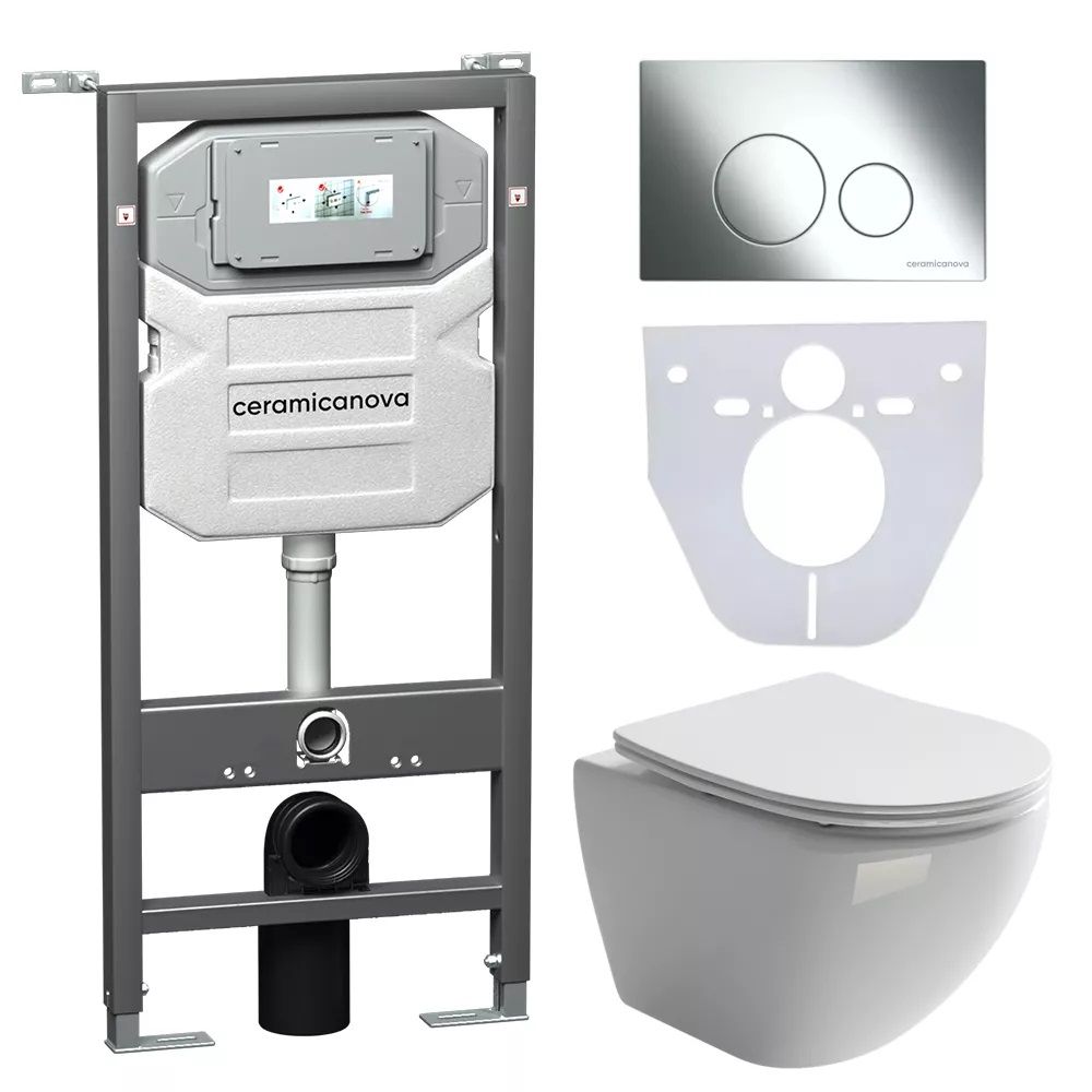 Сет 4 в 1: CN4002_1001CH_1000Подвесной унитаз Metropol Rimless арт. CN4002Шумоизоляционная панель для инсталляции арт. CN1000Система инсталляции для унитазов CERAMICANOVA Envision с кнопкой смыва Round цвет хром и креплениями, арт. CN1001CHПодвесной унитаз Metropol Rimless CN4002, глубокий смыв, с крепежом для полностью скрытого монтажа, ультра тонким с сидением и крышкой с функцией плавного закрытия, дюропласт.