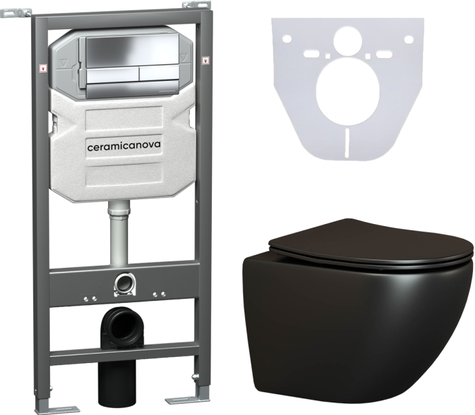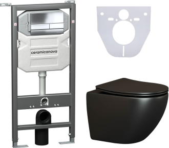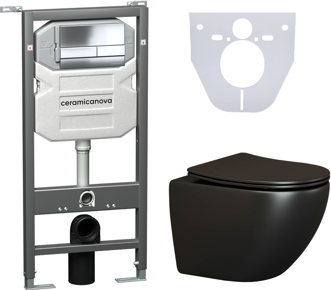Сет 4 в 1: CN4002MB_1002CH_1000Подвесной унитаз Metropol Rimless арт. CN4002MBШумоизоляционная панель для инсталляции арт. CN1000Система инсталляции для унитазов CERAMICANOVA Envision с кнопкой смыва Flat цвет хром, креплениями, арт. CN1002CH Подвесной безободковый унитаз Ceramica Nova Metropol Rimless черный матовый, сиденье микролифт, CN4002MB