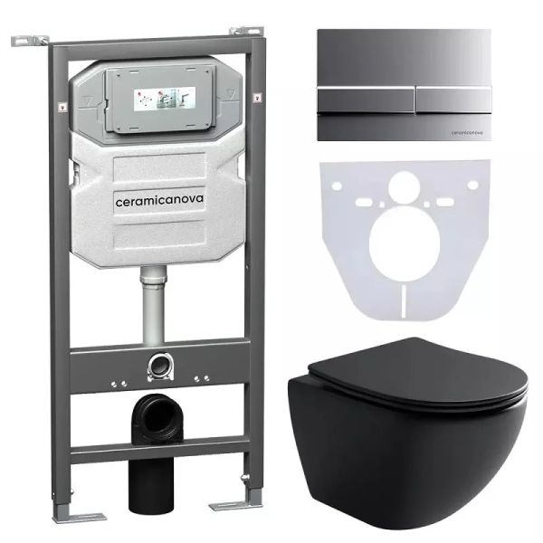 Сет 4 в 1: CN4002MB_1002M_1000Подвесной унитаз Metropol Rimless арт. CN4002MBШумоизоляционная панель для инсталляции арт. CN1000Система инсталляции для унитазов CERAMICANOVA Envision с кнопкой смыва Flat цвет хром матовый, креплениями, арт. CN1002M Подвесной унитаз Metropol Rimless CN4002MB, глубокий смыв, с крепежом для полностью скрытого монтажа, ультра тонким с сидением и крышкой с функцией плавного закрытия, дюропласт.Шумоизоляционная панель для инсталляции CN1000