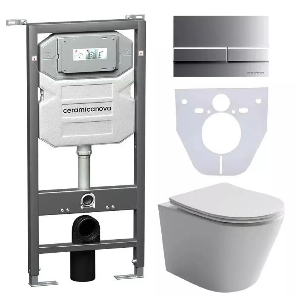 Сет 4 в 1: CN6000_1002M_1000Подвесной унитаз Balearica Rimless арт. CN6000Шумоизоляционная панель для инсталляции арт. CN1000Система инсталляции для унитазов CERAMICANOVA Envision с кнопкой смыва Flat цвет хром матовый, креплениями, арт. CN1002M Подвесной унитаз Balearica Rimless CN6000, глубокий смыв, с крепежом для полностью скрытого монтажа, ультра тонким с сидением и крышкой с функцией плавного закрытия, дюропластШумоизоляционная панель для инсталляции CN1000