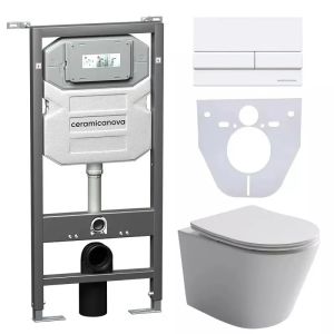 Сет 4 в 1: CN6000_1002W_1000Подвесной унитаз Balearica Rimless арт. CN6000Шумоизоляционная панель для инсталляции арт. CN1000Система инсталляции для унитазов CERAMICANOVA Envision с кнопкой смыва Flat цвет белый, креплениями, арт. CN1002W Подвесной унитаз Balearica Rimless CN6000, глубокий смыв, с крепежом для полностью скрытого монтажа, ультра тонким с сидением и крышкой с функцией плавного закрытия, дюропласт