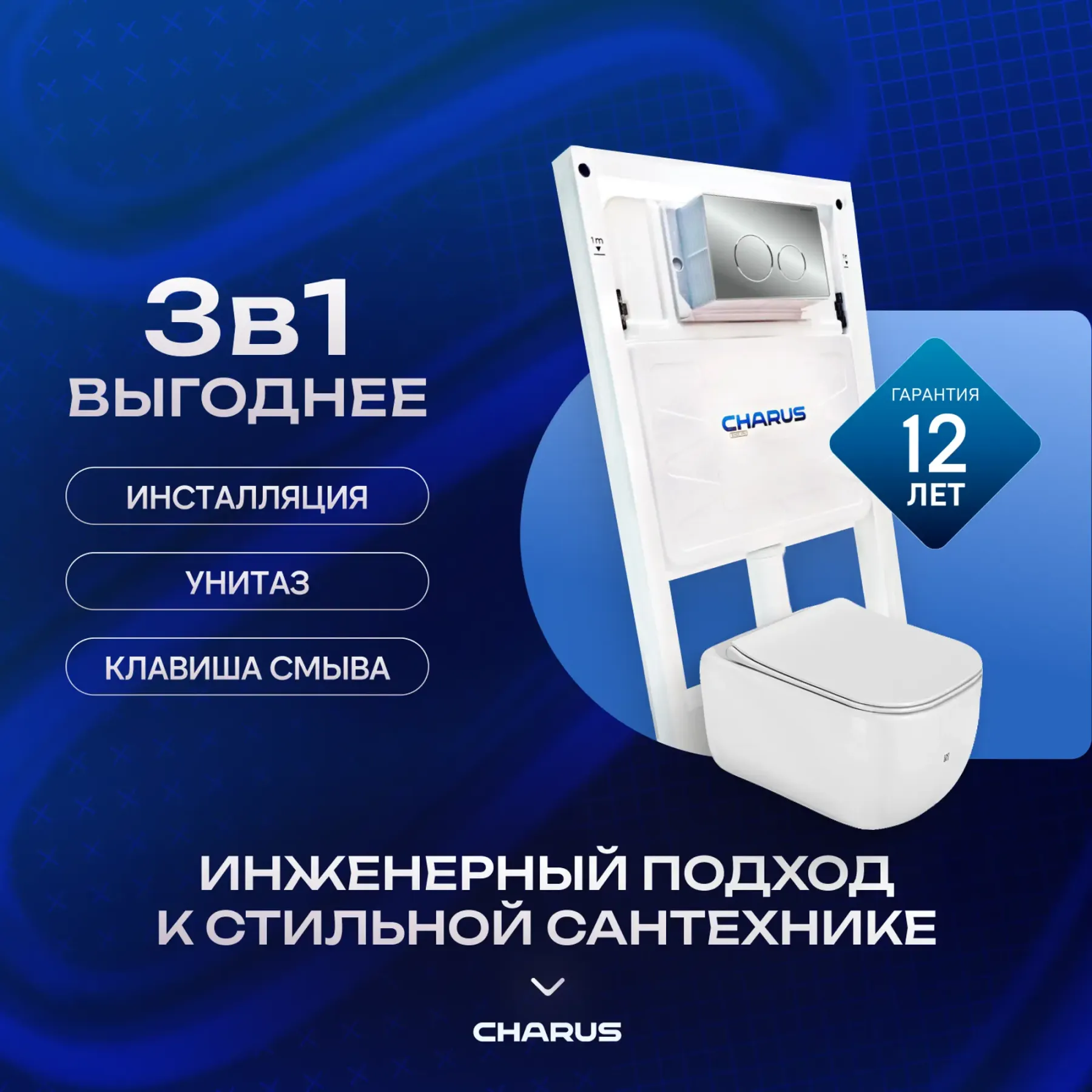 Комплект унитаза с инсталляцией CHARUS SET.114W.11.3 клавишей смыва белаяИнсталляция с бачком для подвесного унитаза CHARUS TM — универсальная система от опытного российского производителя. По качеству и функциональности продукция ни в чем не уступает европейским брендам. Срок эксплуатации товара — более 25 лет. Гарантия на конструкцию действует 12 лет с момента покупки. Гарантия на поставку запасных частей — 15 лет. В течение этого времени каждый покупатель может обратиться за бесплатным гарантийным обслуживанием.• Инсталляция совместима с унитазами любых брендов.• Большой ревизионный люк упрощает монтаж внутренних элементов, а лазерная отметка уровня 1 м до чистого пола гарантирует корректную установку конструкции.• Двухкнопочная система настройки слива позволяет с легкостью управлять объемом сливаемой воды и экономить до 8 литров в день. Смывной бачок скрытого монтажа обеспечивает максимально тихий слив, а значит, инсталляция практически бесшумна.• Контроль качества продукции осуществляется на всех стадиях производства: специалисты Чарус тщательно проверяют каждую партию.Материал — сталь и пластик, нижнее основание рамного каркаса оцинковано. В местах крепления керамики толщина изделия увеличена до 3 мм. Благодаря повышенной прочности каждого элемента инсталляция выдерживает до 400 кг.