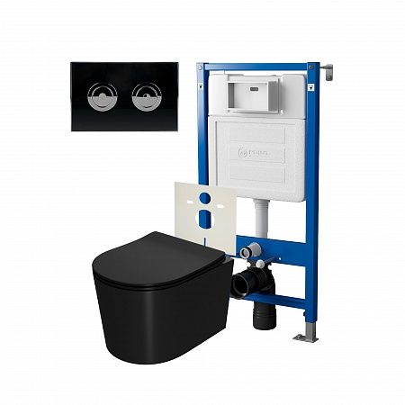 Сет: Система инсталляции пневматическая Point Элемент П для подвесного унитаза PN45121 + Клавиша смыва для пневматической инсталляции Point Венера, установка в стену, черный/хром, PN44071BC + Унитаз подвесной Point Веста безободковый, чёрн мат, PN41701BM