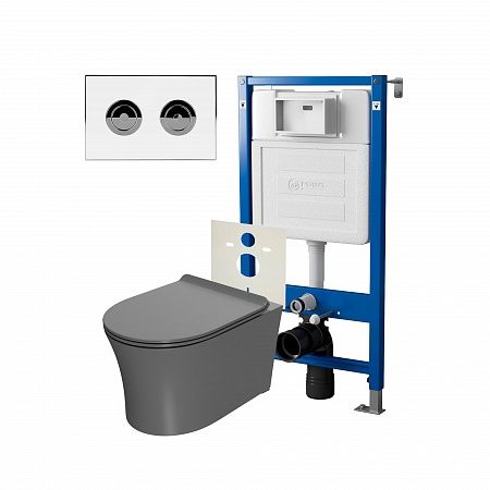 Сет: Система инсталляции пневматическая Point Элемент П для подвесного унитаза PN45121 + Клавиша смыва для пневматической инсталляции Point Венера, установка в стену, белый/хром, PN44071WC + Унитаз подвесной Point Вега безободковый, сер мат, PN41711GM