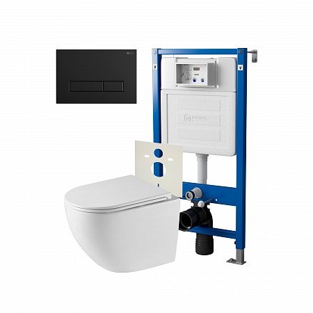 Сет: Система инсталляции Point Элемент для подвесного унитаза PN45120 + Клавиша смыва для инсталляции Point Меркурий, черная матовая, PN44831BM + Унитаз подвесной Point Сатурн безободковый, белый, сиденье дюропласт микролифт быстросъемное PN41901