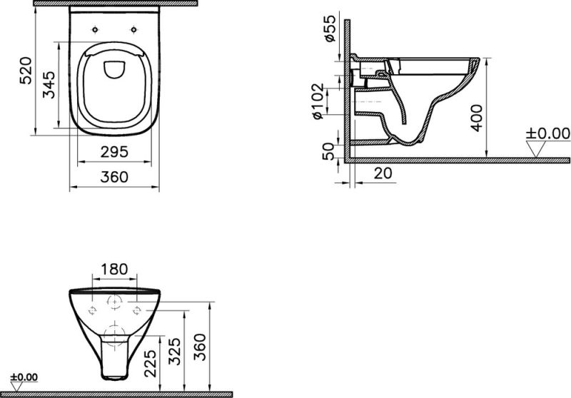 Комплект VitrA S20 9004B003-7207 Унитаз подвесной безободковый, с микролифтом + Система инсталляция + Кнопка смыва