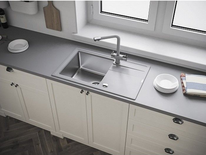 Цвет грей (серая) подходит к столешницам разных цветов от светлых до темных, отлично будет смотреться грей на темных столешницах.