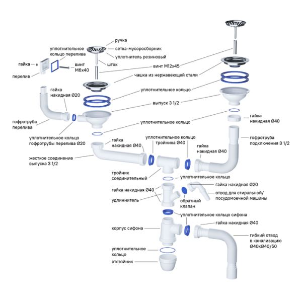 Сифон с отдельным отводом для стиральной/посудомоечной машины с обратным клапаном и гофрированными отводами для удобства подключения. Гарантия на стальные мойки IDDIS® – 15 лет, на сифон – 2 года, на крепления – 1 год.