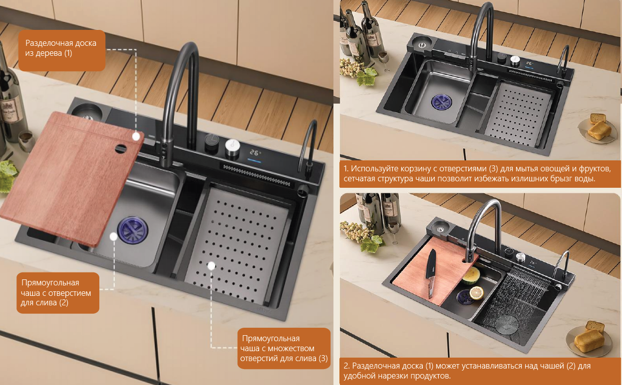• благодаря модульной структуре мойки, можно менять местами чаши, устанавливать разделочную доску в разных положениях, что значительно экономит место на кухне и позволяет избежать лишних загрязнений