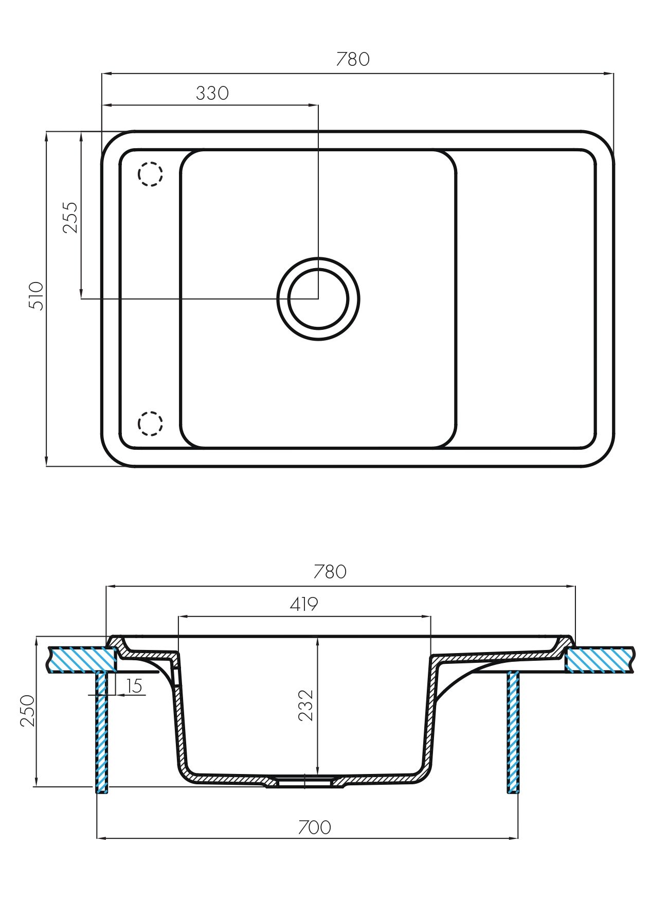 • Отверстия под смеситель: