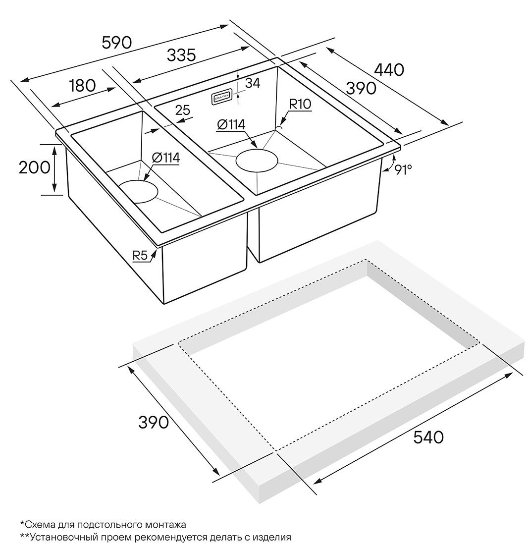 • Отверстия под смеситель: