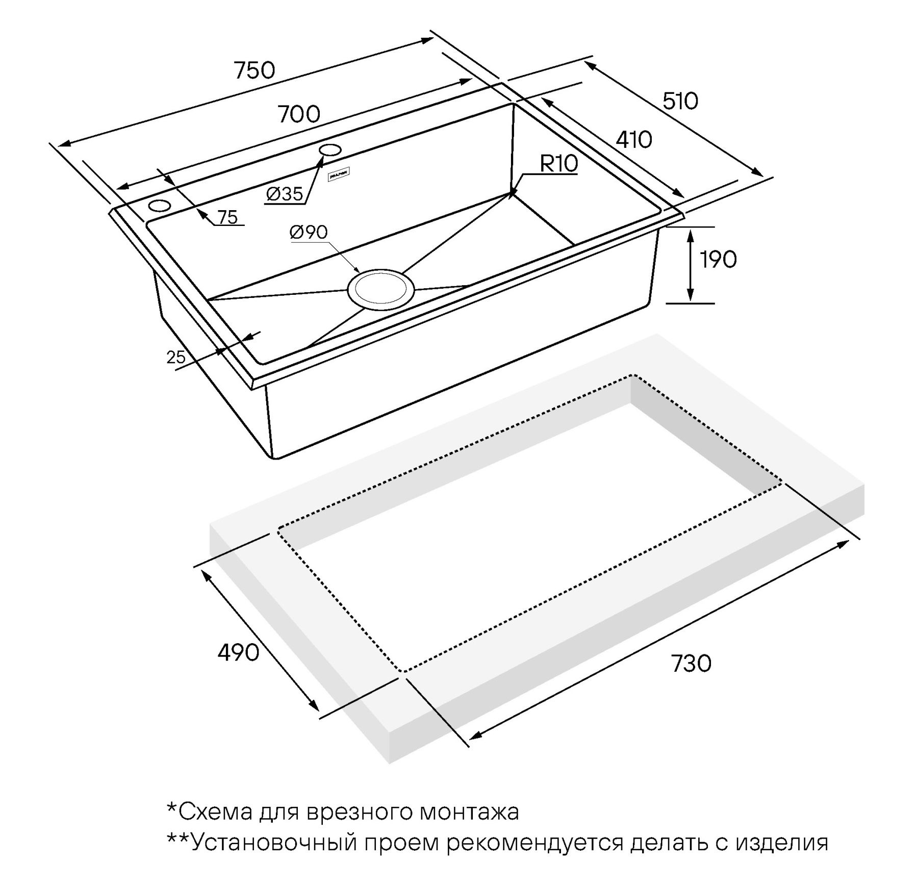 • Отверстия под смеситель:
