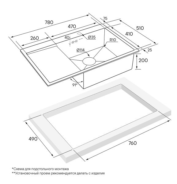 • Отверстия под смеситель: