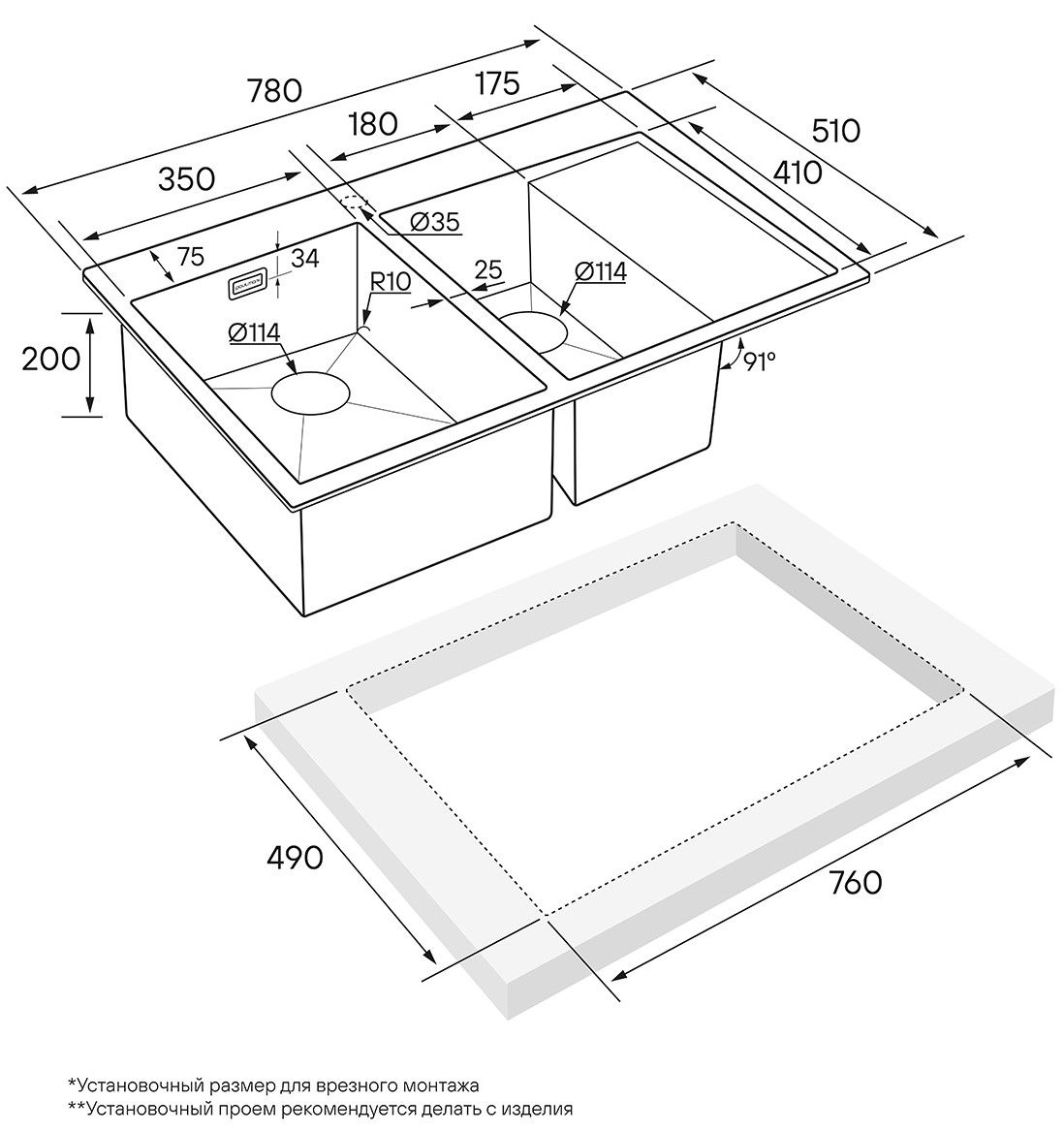 • Отверстия под смеситель: