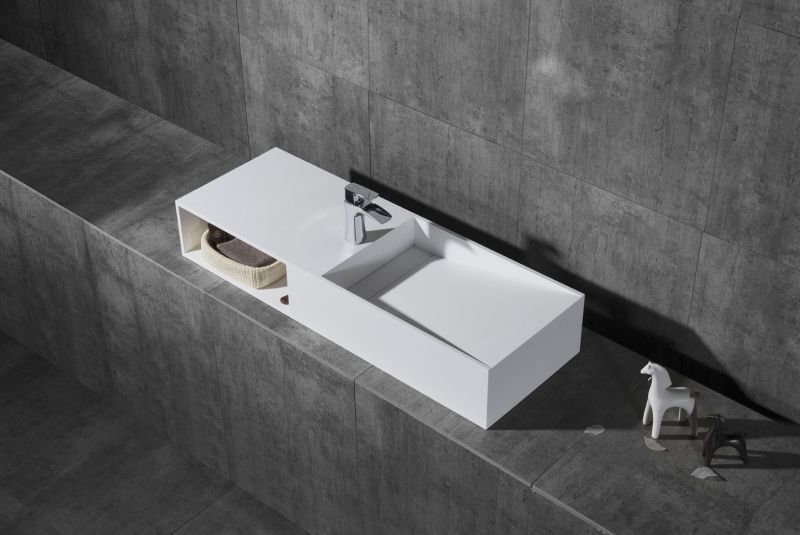 Уникальный дизайн раковины Кальяри разработан специально для людей ценящих нестандартные решения. Прямоугольная раковина из искусственногокамня разделена на две части смесителем. Одна часть представляет собой непосредственно чашу раковины, другая – своеобразную полочку, в которой удобно хранить мыло, полотенце, зубную щётку и прочие предметы гигиены. Слив этой раковины оборудован так же нестандартным образом, и представляет собой платформу для декоративной каменной накладки.