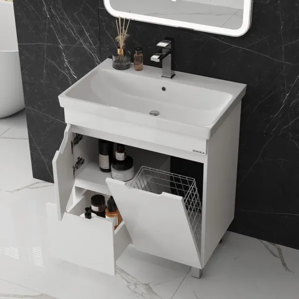 В левой части тумбы расположено пространство за дверцей с доводчиком, под ним ящик с направляющими полного выдвижения, в правой части - откидная дверь с корзиной для белья. Ручки, изящно интегрированные в фасады, позволяют сделать эксплуатацию мебели более удобной и практичной.