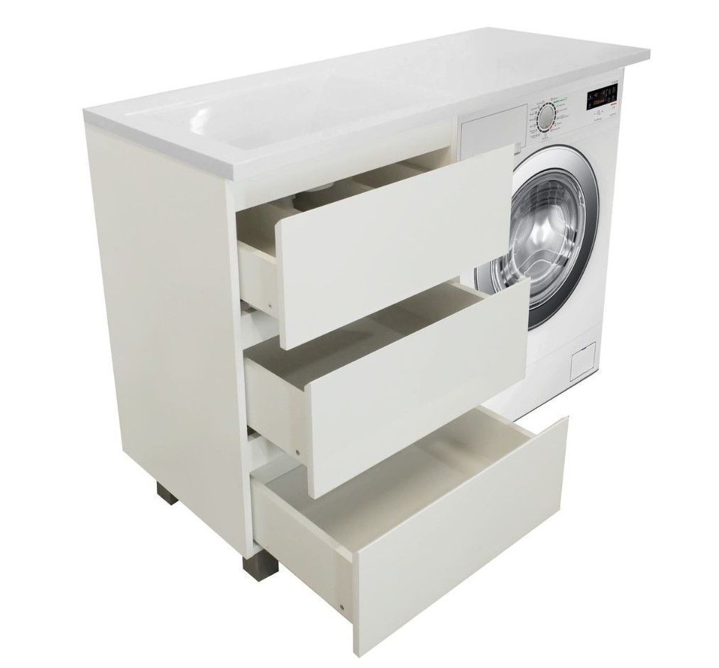 Приоритетом в выборе тумбы с раковиной является площадь ванной комнаты. Функциональная тумба с тремя ящиками решит вопрос для большинства покупателей. Тумба укомплектована раковиной из литьевого мрамора с удобной чашей, стиральная машина устанавливается под столешницей. Три ящика позволят распределить как крупные, так и мелкие вещи.