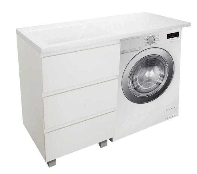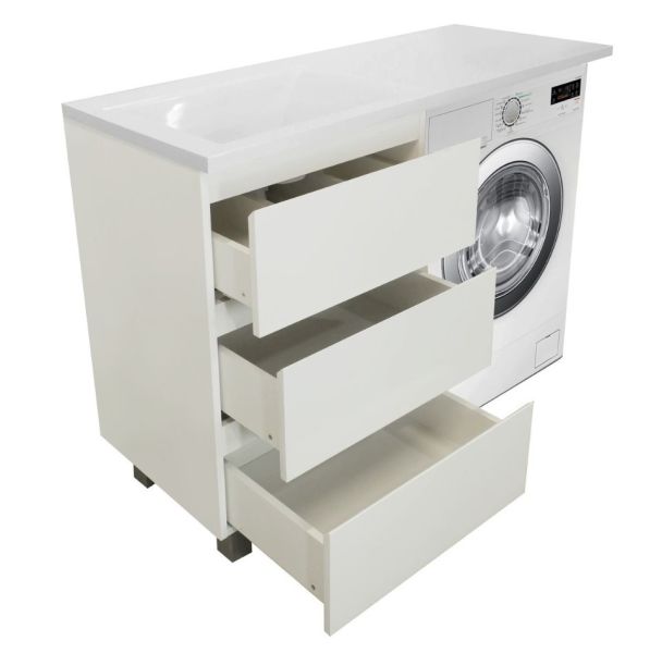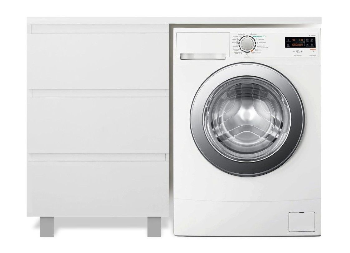 Приоритетом в выборе тумбы с раковиной является площадь ванной комнаты. Функциональная тумба с тремя ящиками решит вопрос для большинства покупателей. Стиральная машина устанавливается под столешницей. Три ящика позволят распределить как крупные, так и мелкие вещи.
