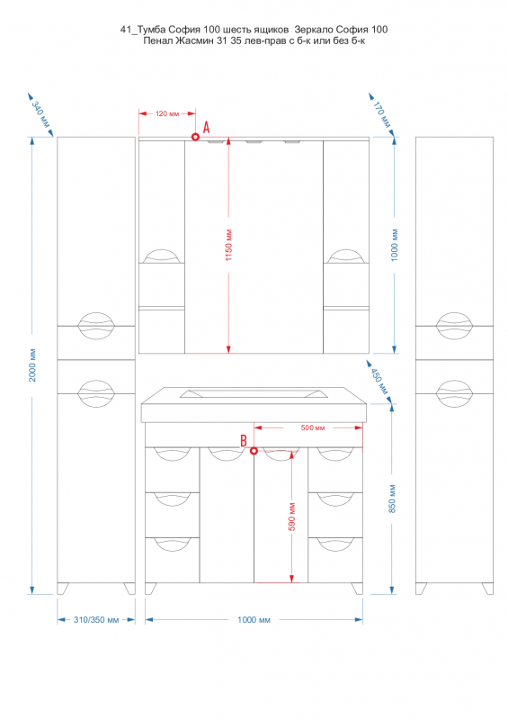 Напольная тумба под раковину Misty София с шестью ящиками 100см белый купить