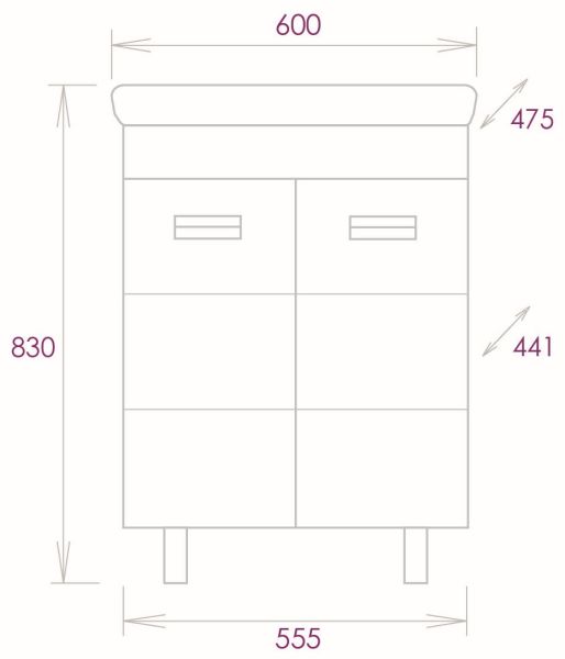 Размеры тумбы без учета раковины и ножек: 55x44x67 см.