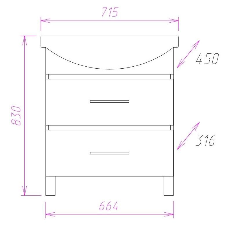 Размеры тумбы без учета раковины и ножек: 66х32x68 см.