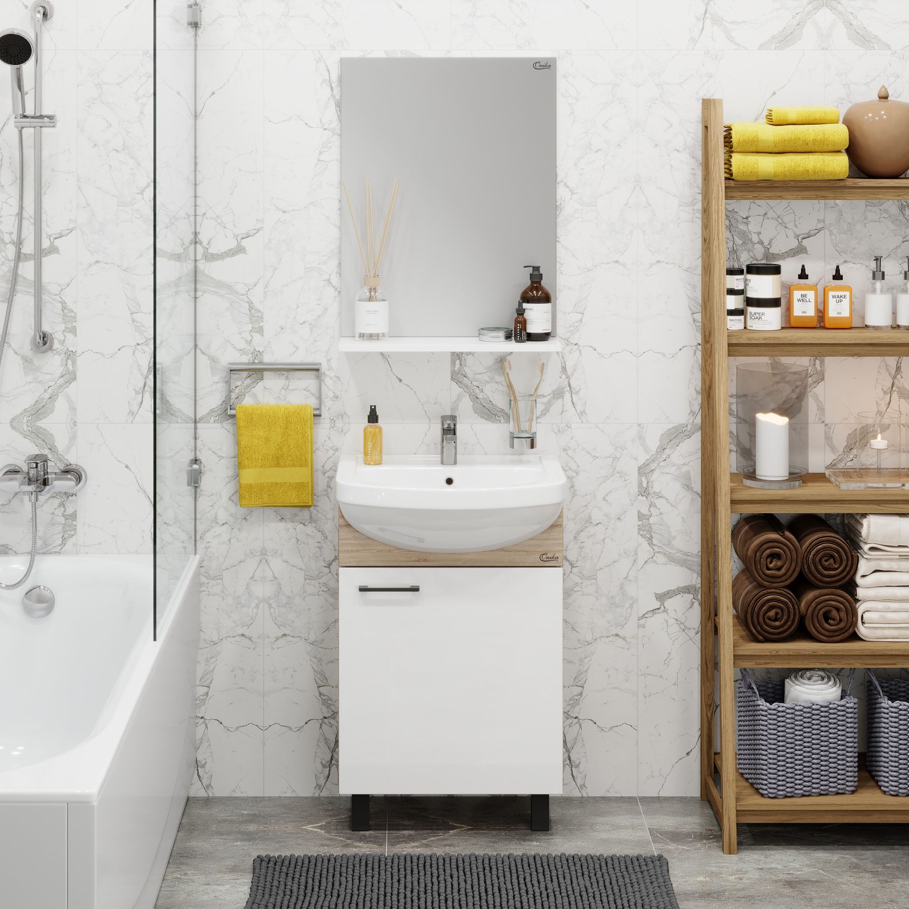 Компактные габариты позволяют грамотно организовать небольшой санузел, а белый фасад и корпус цвета дуба гармонично сочетаются с черной фурнитурой и отлично впишутся в интерьер любой ванной комнаты.