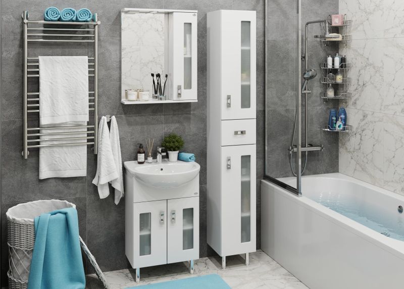 Белоснежный глянцевый цвет фасада в сочетании со вставками из матового стекла и хромированными ручками необычной формы придадут ванной комнате ощущение свежести, чистоты и уюта.
