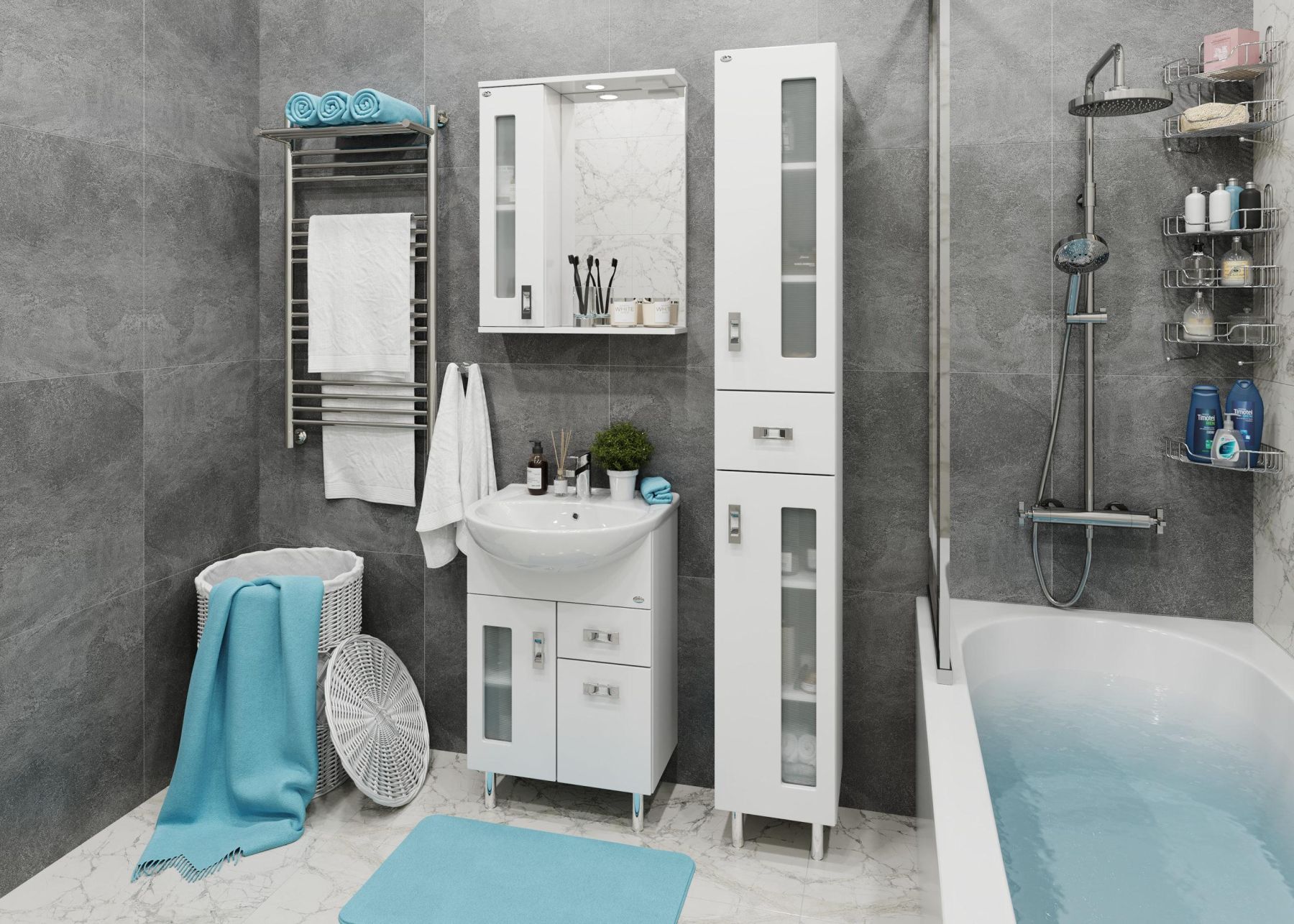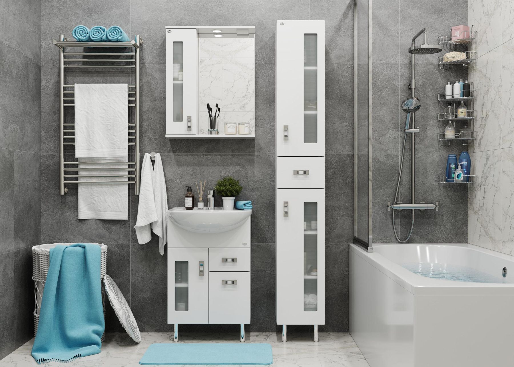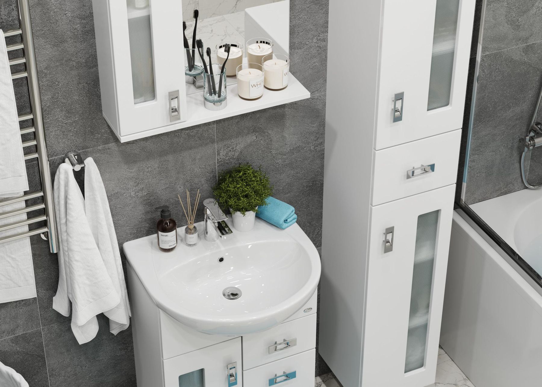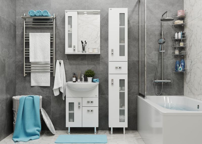 Белоснежный глянцевый цвет фасада в сочетании со вставками из матового стекла и хромированными ручками необычной формы придадут ванной комнате ощущение свежести, чистоты и уюта.