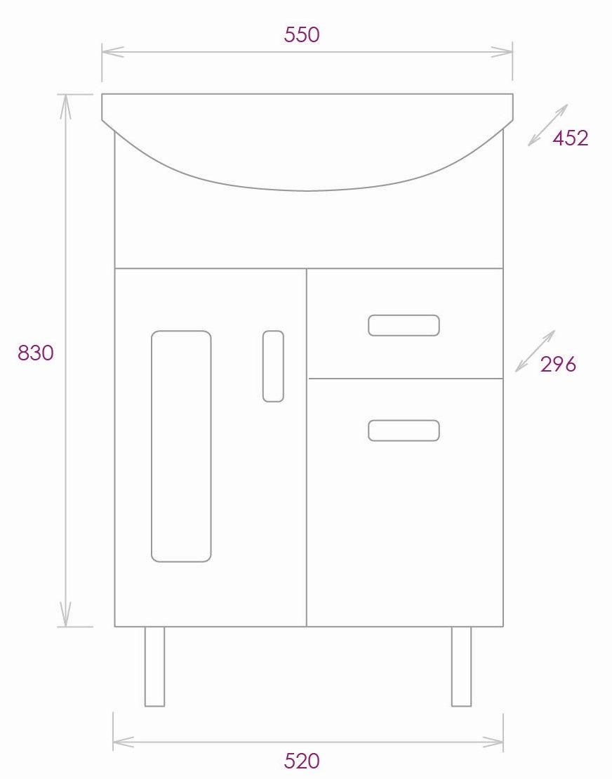 Размеры тумбы без учета раковины и ножек: 52x30x68 см.