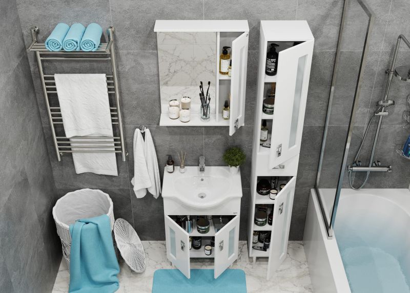 За распашными дверцами, снабженными системой плавного закрывания и украшенными хромированными ручками, скрывается просторное внутреннее пространство, разделенное горизонтальной полкой: оно служит для размещения необходимых бытовых принадлежностей.