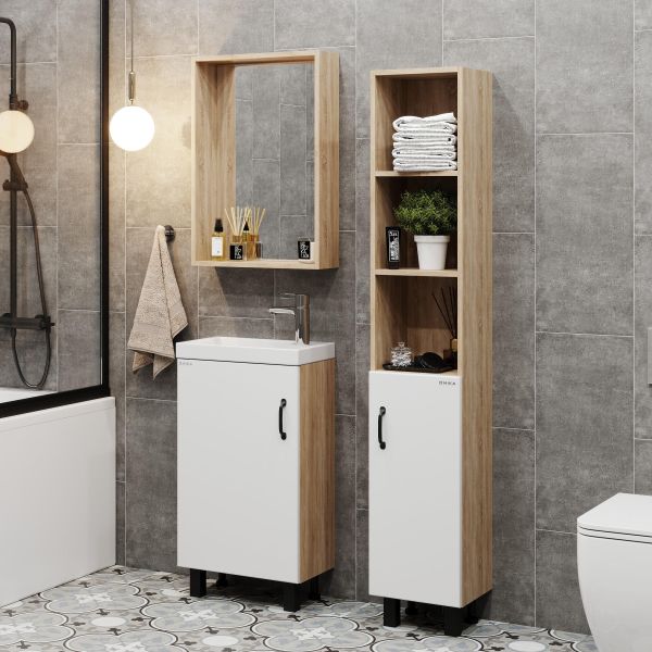 В тумбе Onika Тимбер 45 удачно сочетаются контрастные цвета и фактуры: белый матовый фасад с покрытием SoftTouch, корпус цвета дуба с роскошной текстурой, черная матовая металлическая фурнитура.