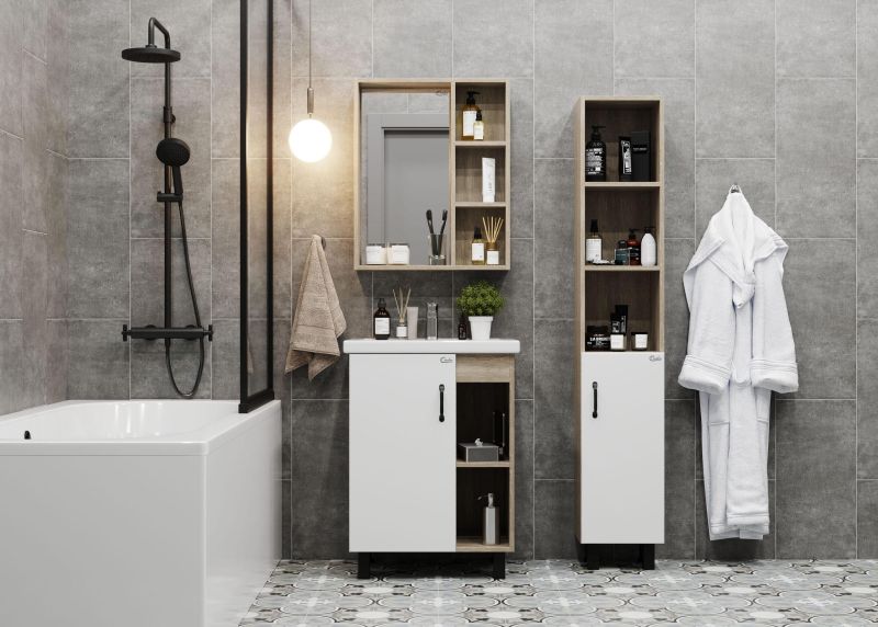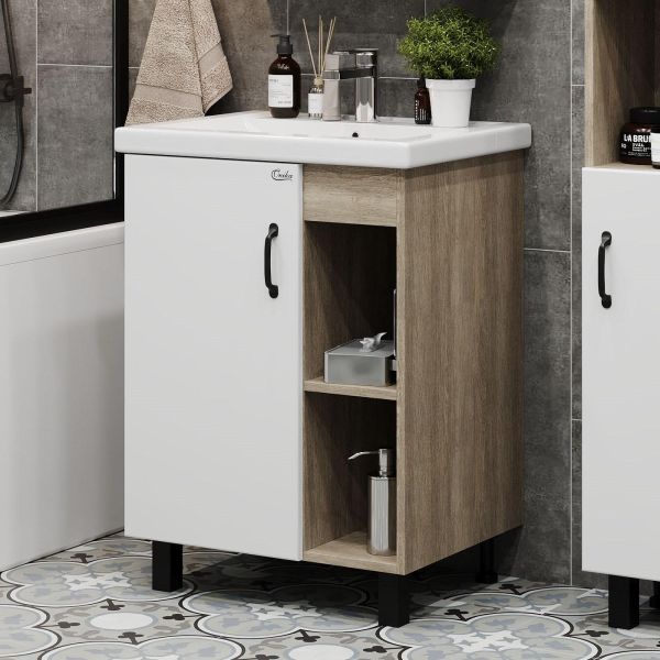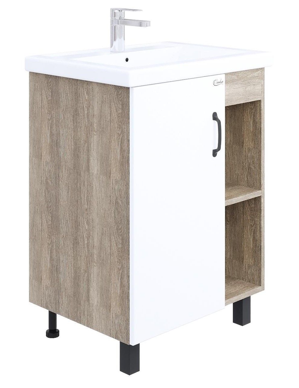 В тумбе Onika Тимбер 60 удачно сочетаются контрастные цвета и фактуры: белый матовый фасад с покрытием SoftTouch, корпус цвета дуба с роскошной текстурой, черная матовая металлическая фурнитура.