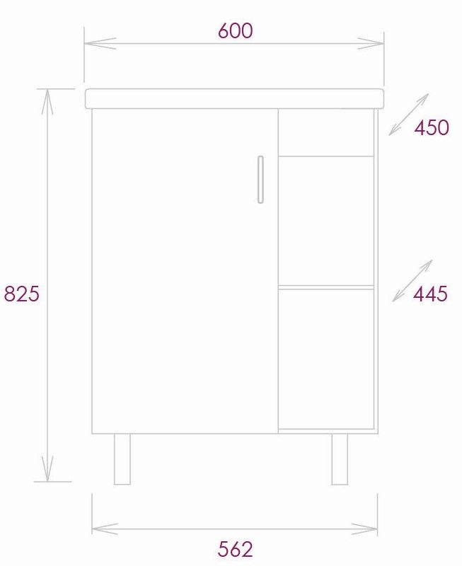 Размеры тумбы без учета раковины и ножек 56x44x68 cм.