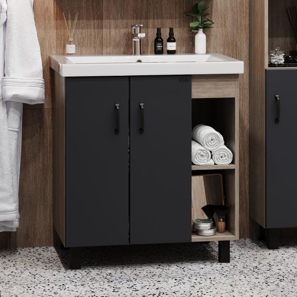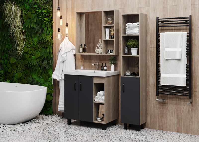 В тумбе Onika Тимбер 70 удачно сочетаются контрастные цвета и фактуры: серый матовый фасад с покрытием SoftTouch, корпус цвета дуба с роскошной текстурой, черная матовая металлическая фурнитура.