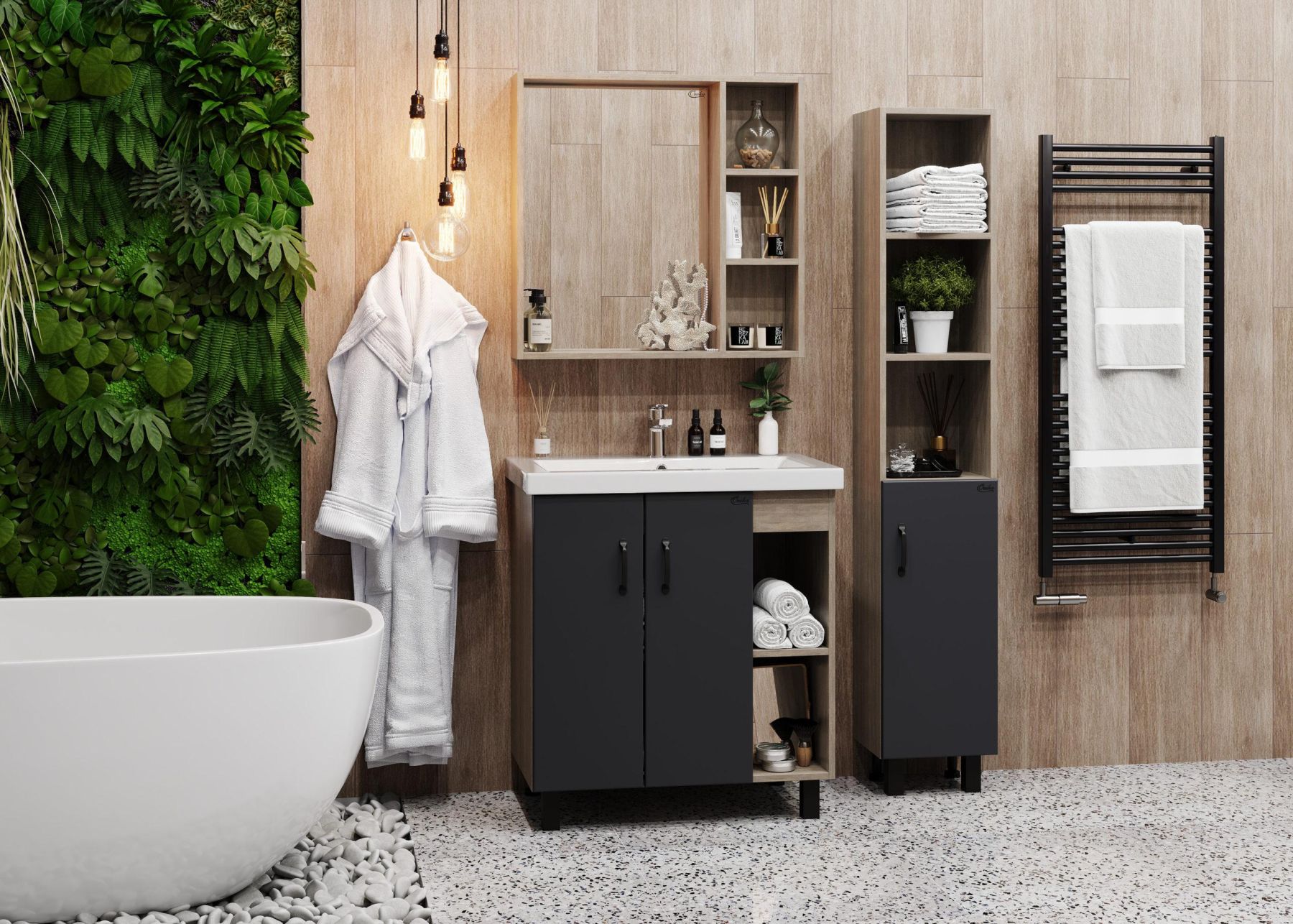 Открытые полки справа обеспечивают быстрый доступ к часто используемым аксессуарам, а пространство за распашными дверцами слева, снабженными системой плавного закрывания, станет удобным местом для хранения различных бытовых принадлежностей.
