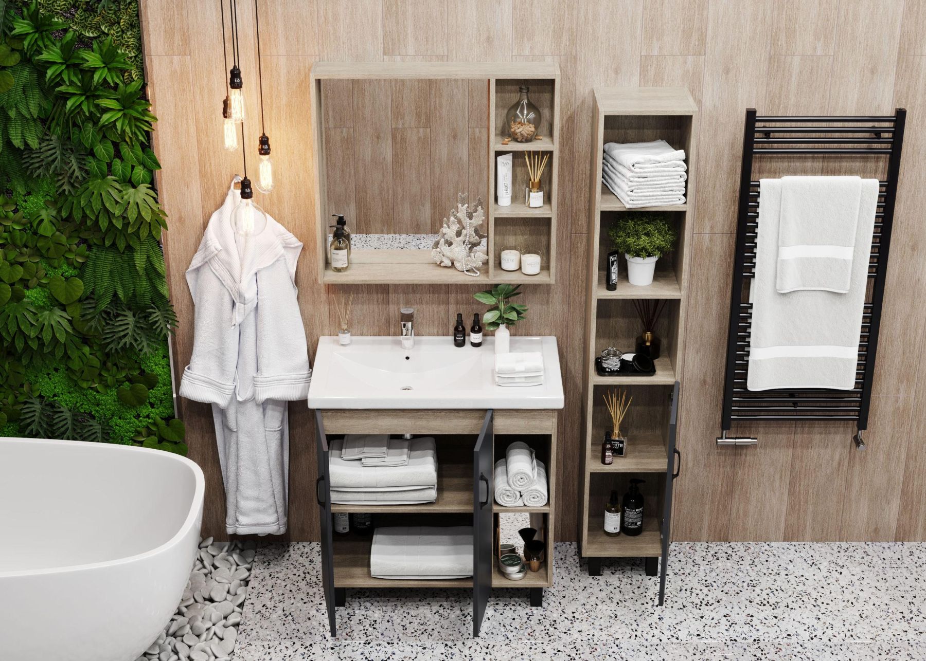 В тумбе Onika Тимбер 80 удачно сочетаются контрастные цвета и фактуры: серый матовый фасад с покрытием SoftTouch, корпус цвета дуба с роскошной текстурой, черная матовая металлическая фурнитура.