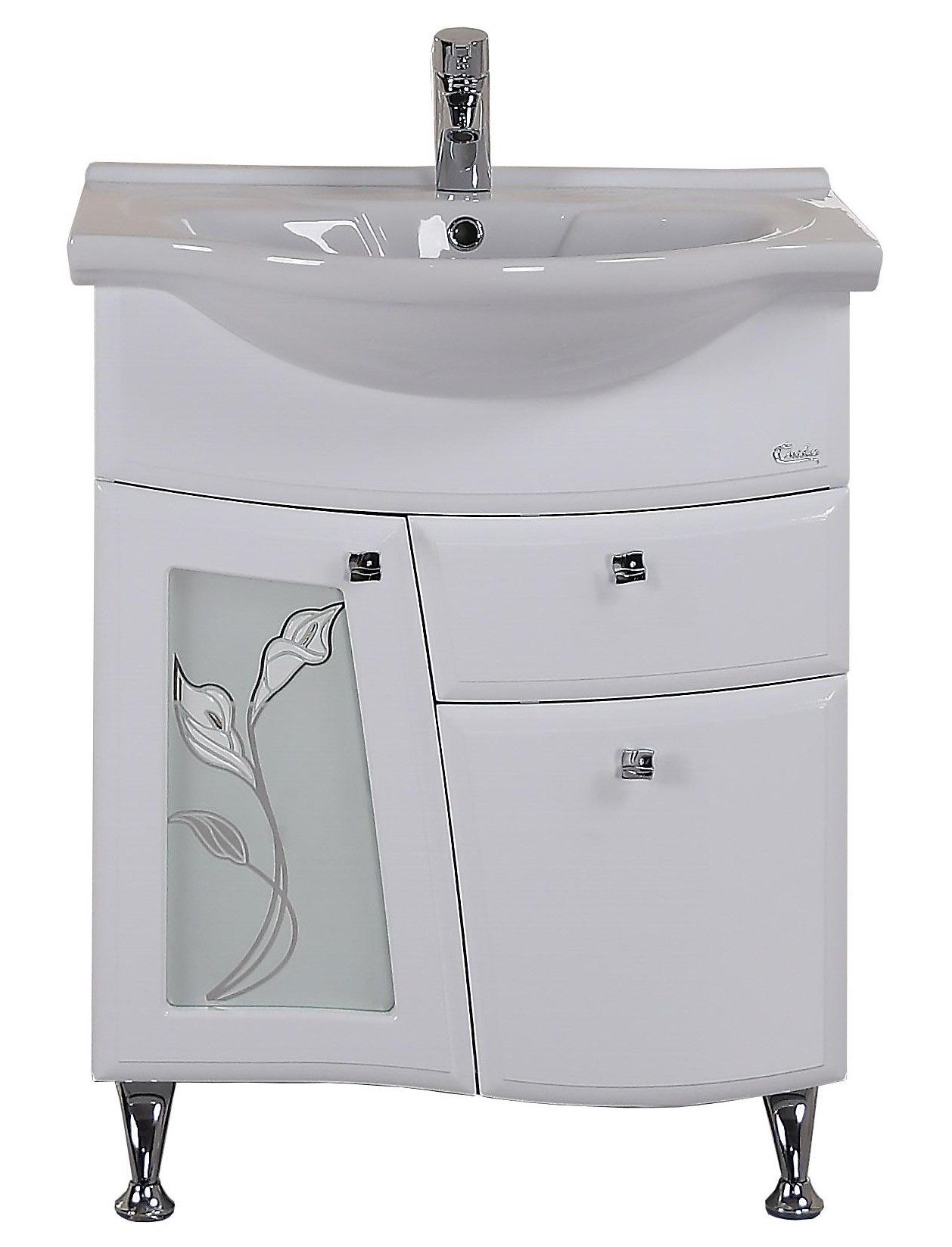 Эстетика тумбы представлена белоснежным глянцевым фасадом, вставкой из матового стекла с изящным цветочными рисунком и хромированной элегантной фурнитурой.