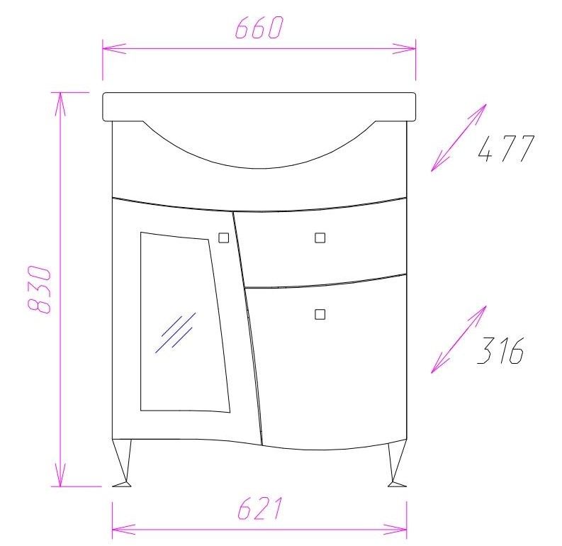 Размеры тумбы без учета раковины и ножек: 62x32x70 см.