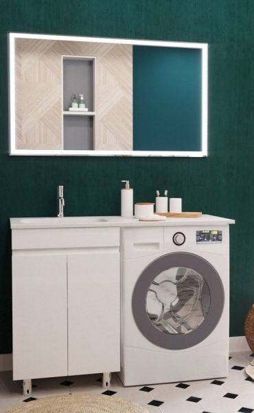 Тумба укомплектована раковиной из литьевого мрамора c глубокой чашей, плавными изгибами и вкладышем для слива. Раковина с большой столешницей удобная и функциональная. В тумбе 2 распашных дверцы со скрытыми ручками и полкой внутри, что делает использование максимально комфортным. Стиральная машина устанавливается под столешницей, за счет чего экономит место в ванной комнате.
