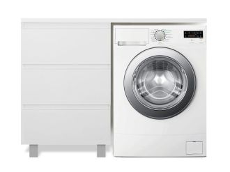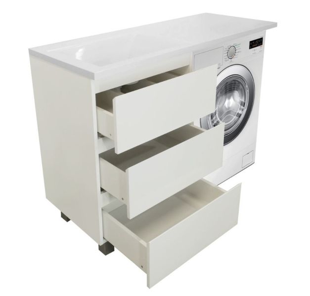Приоритетом в выборе тумбы с раковиной является площадь ванной комнаты. Функциональная тумба с тремя ящиками решит вопрос для большинства покупателей. Тумба укомплектована раковиной из литьевого мрамора с удобной чашей, стиральная машина устанавливается под столешницей. Три ящика позволят распределить как крупные, так и мелкие вещи.