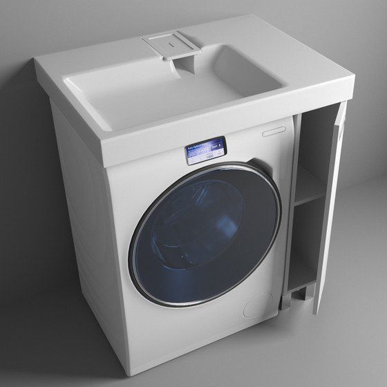 Простые и четкие линии тумбы идеально впишутся в интерьер в стиле «минимализм», а компактная раковина из литьевого мрамора установленная над стиральной машиной, позволяет сэкономить место в ванной комнате.