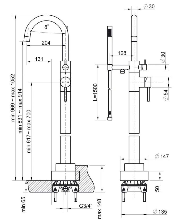 - Напольное расположение и высота смесителя позволяют установку в бассейн, сауну или станут новаторским решением для отдельно стоящей ванны.