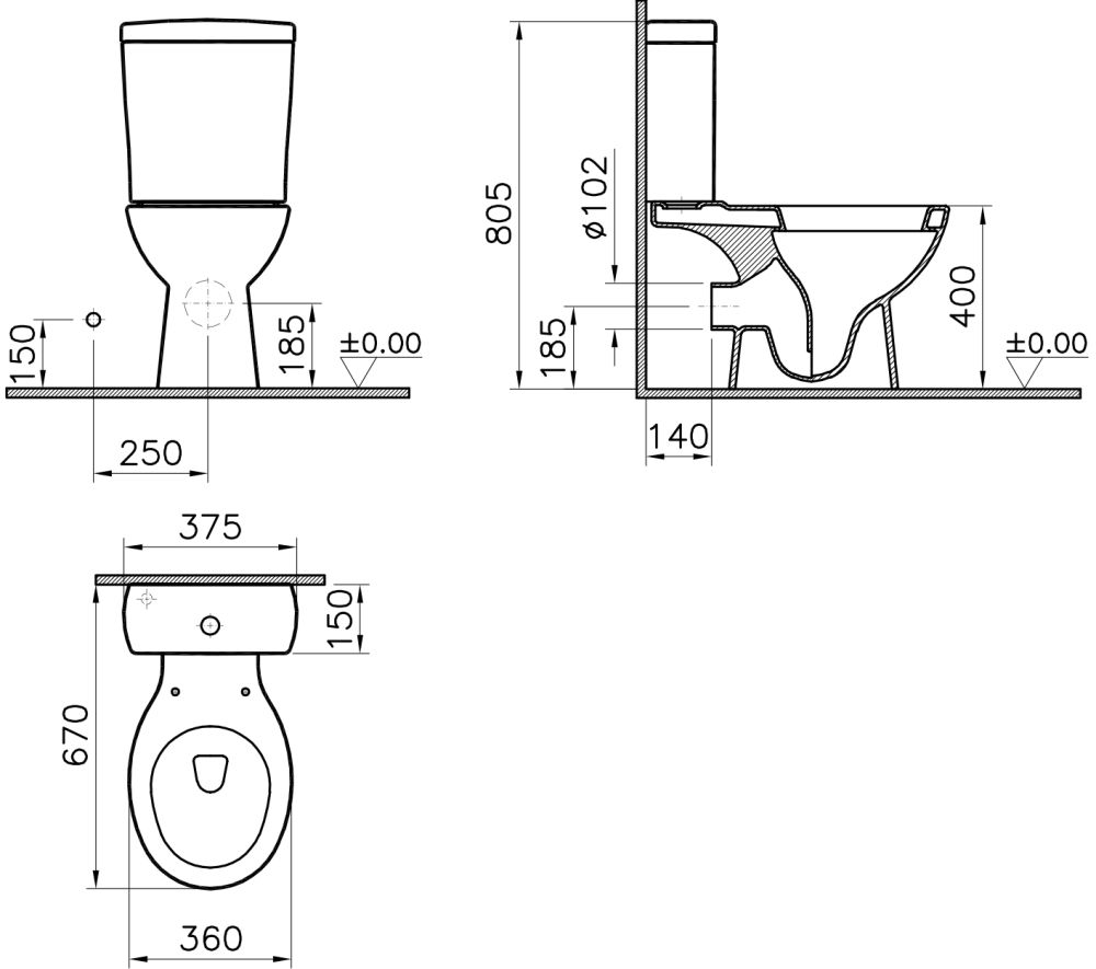 • Прилегание унитаза к стене: