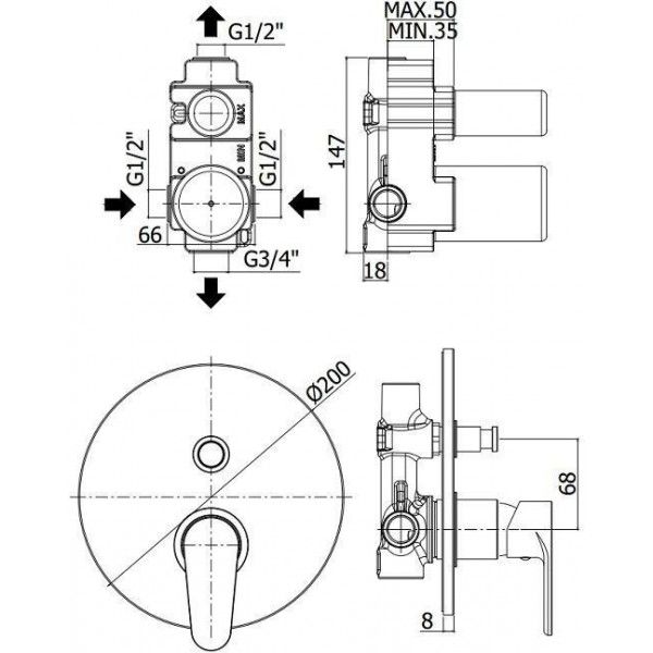 Смеситель встраиваемый для душа на 2 выхода с накладкой латунной диам.200mm, девиатор-кнопка, Хром