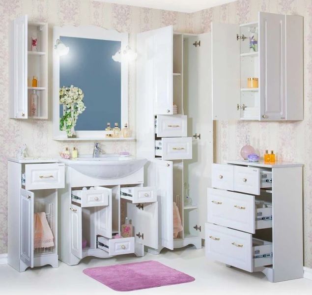 Основное преимущество шкаф-пенала заключается в его вместительности. Удобные полки и ящики позволяют организовать пространство и разместить все необходимое: от косметики до бытовых принадлежностей. Каждая деталь продумана для удобства использования, что делает утренние и вечерние ритуалы более приятными.