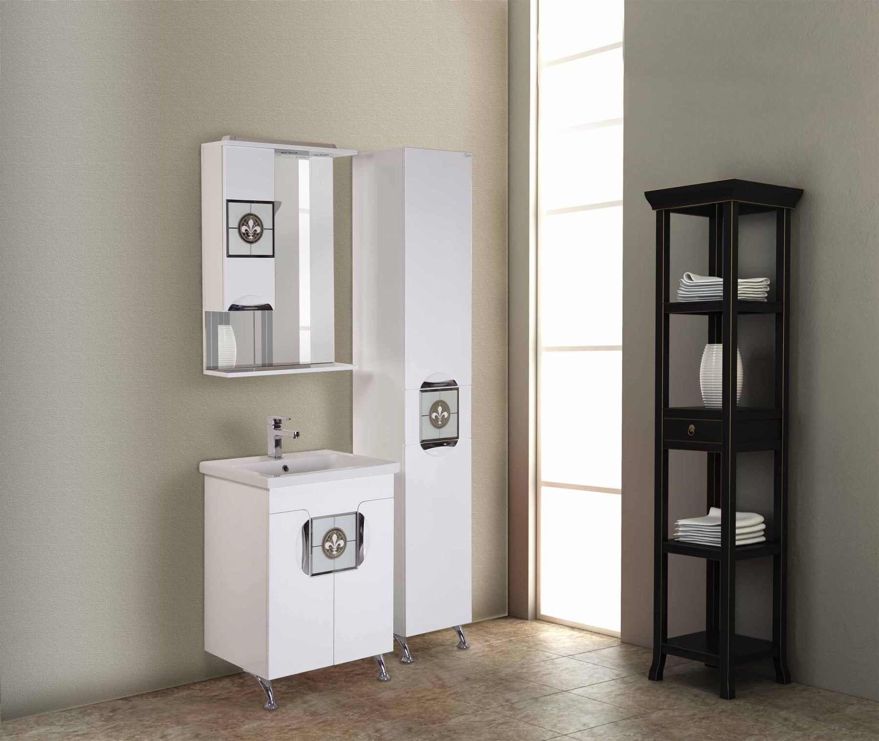 Белый глянцевый фасад пенала украшает декоративный витраж на зеркальном полотне - визитная карточка коллекции ФЛОРЕНА.