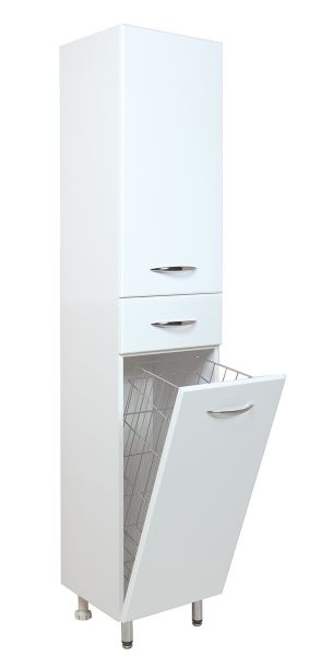 Большое отделение сверху за распашной дверцей с механизмом плавного закрывания, небольшой ящик с направляющими полного выдвижения посередине и отделение с корзиной для белья внизу шкафа обеспечит бережное хранение всех необходимых в ванной комнате вещей. Размер бельевой корзины: 270*370*630.